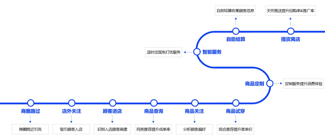 智能服务:深度分析顾客逛店行为规律、历史购买记录、商品偏好度等信息,通过 AI 算法精准推送合适的商品信息到智能机器人/店员,在合适的时机向顾客进行适当推荐。